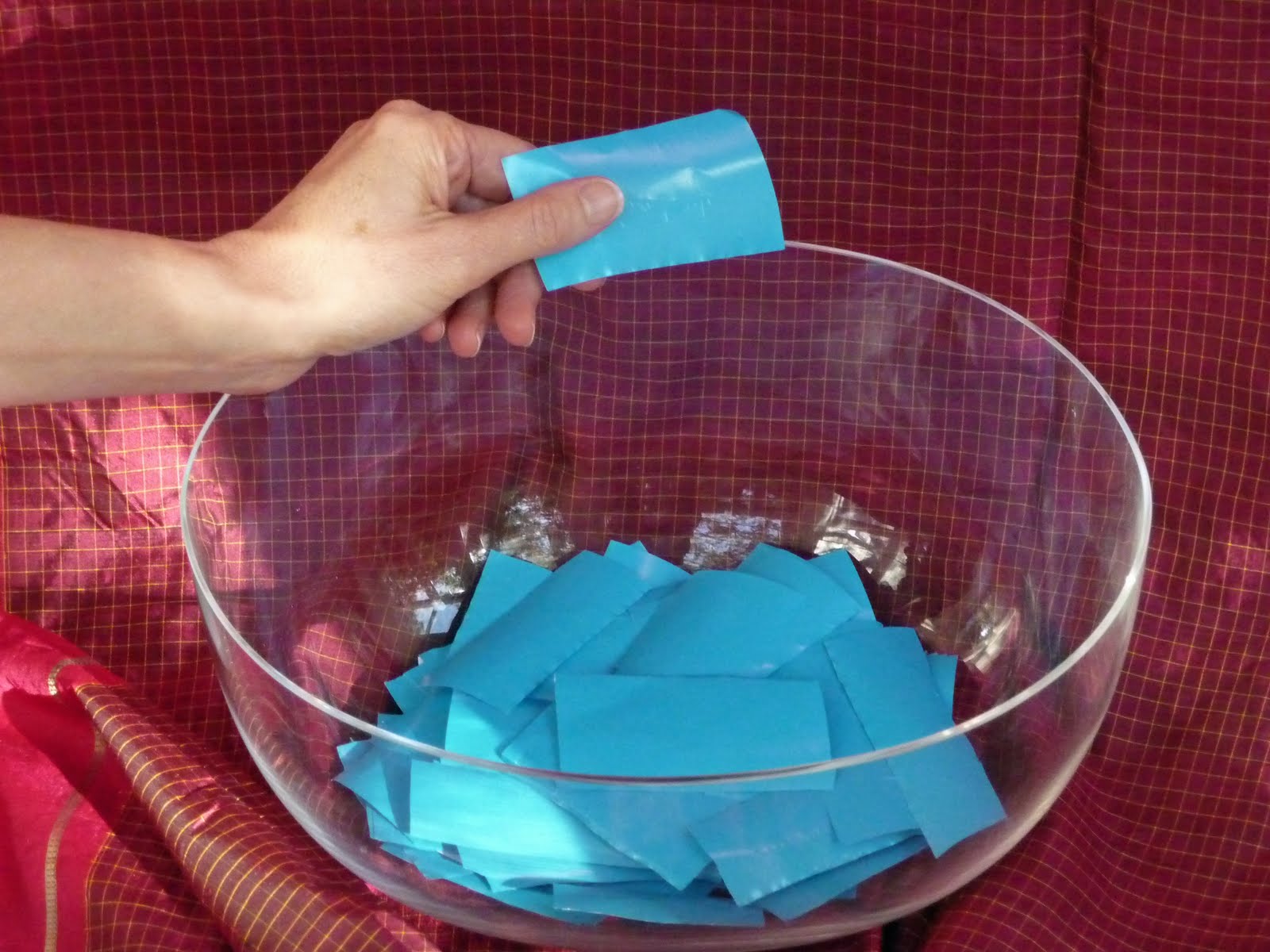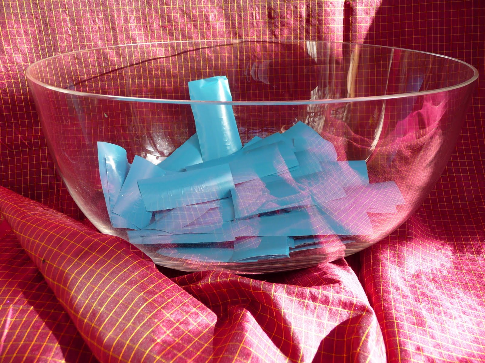 Realizing that there are too many slips of paper to fit into your silver bowl, retrieve the large glass piece from the cupboard, fill it with slips, and mix them up.