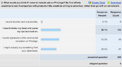 - In context, Privilege currently has approximately 800 subscribers across RSS and Google Followers, with an additional approximate 400 visitors/day.