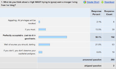 You also asked if I would share the process of commercializing this blog, whatever the outcome. Yes, of course. As a first step, for any lovers of statistics or those wondering what SurveyMonkey actually showed me,