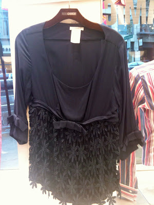 N and I going to Loehmann’s in SF after the holiday mayhem had died down. What’s this, a new blouse store? OMG! It’s NaraCamicie! Open only a few months! Well, this time it was my turn. I bought two gorgeous pieces-a black cotton eyelet with, yes, a double row of (small) buttons and a midnight blue lace number with ruffles, very Oscar de la Renta circa 1967. I raved to my friend Nancy, a clothing connoisseur, about the new SF arrival.