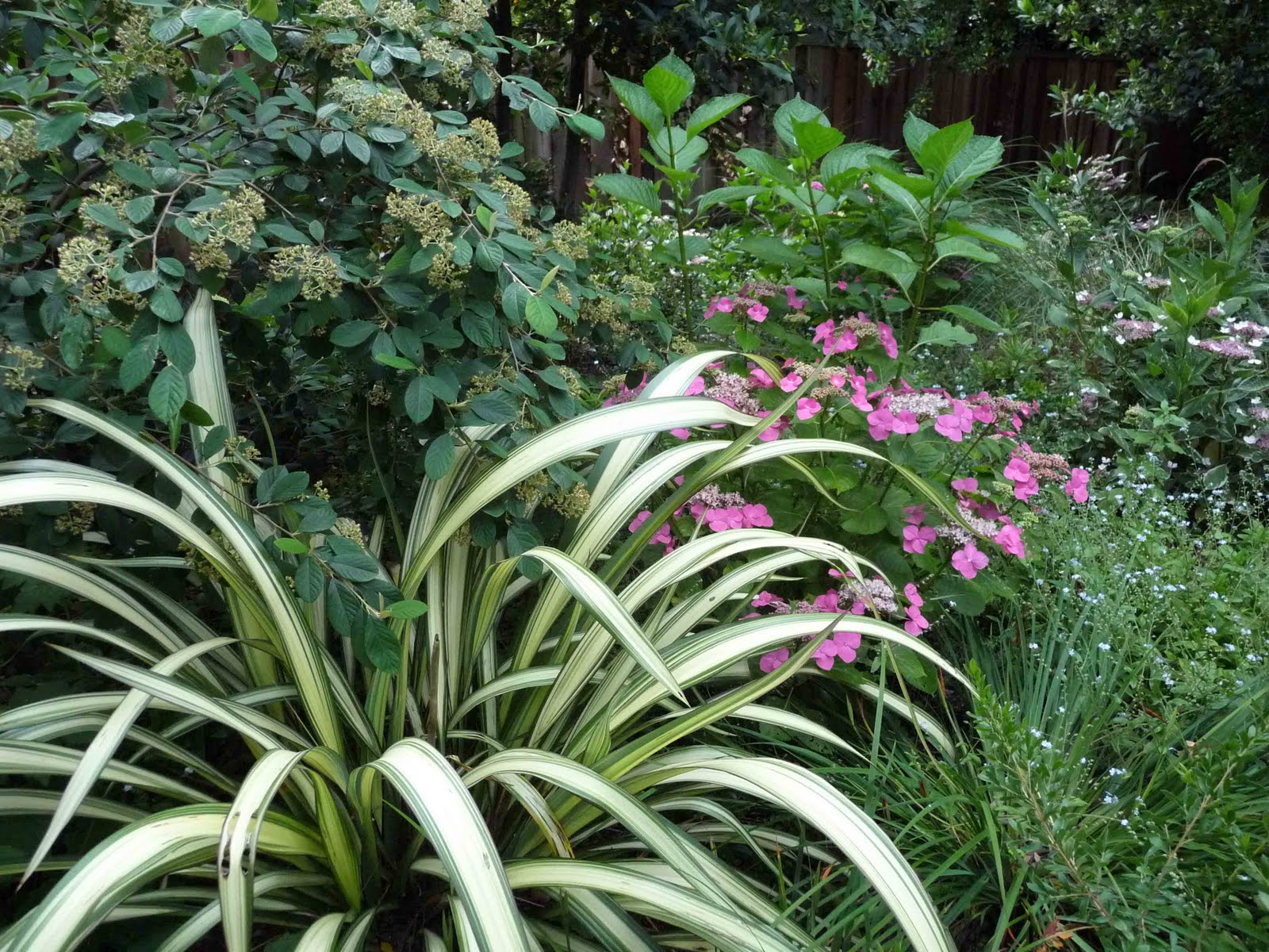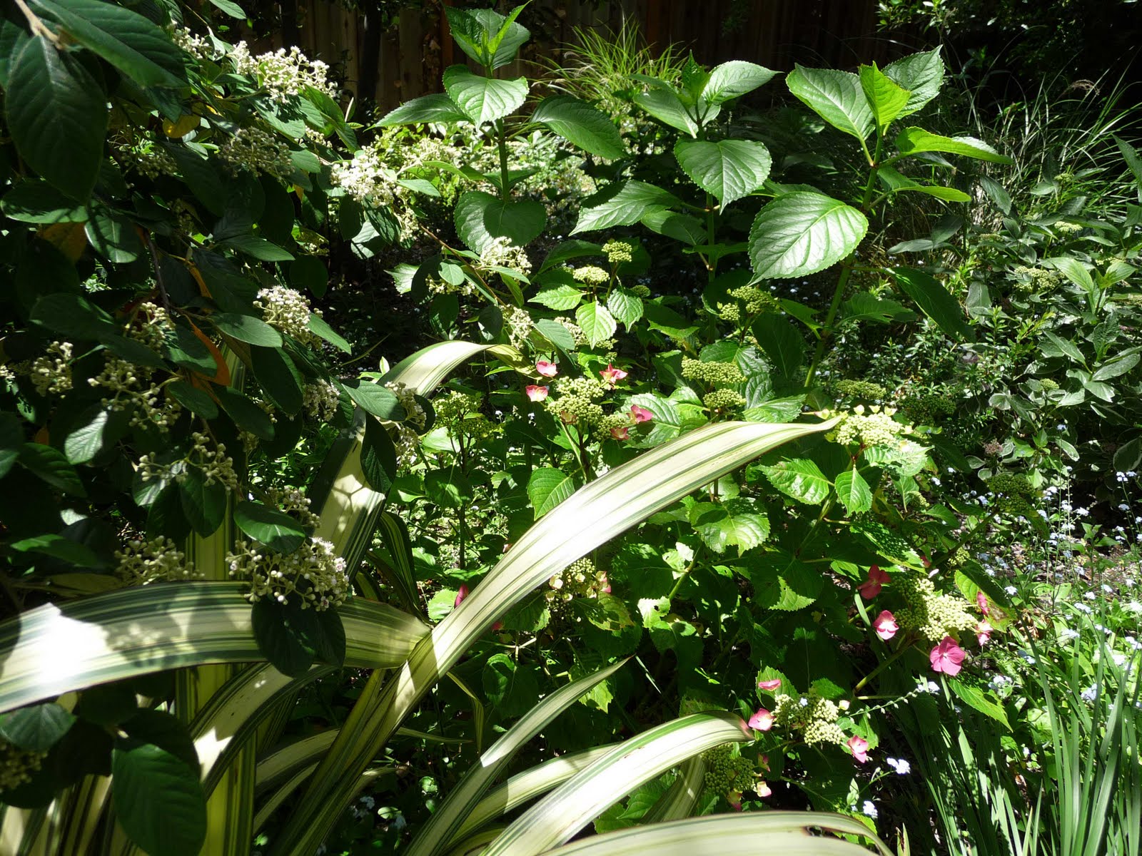 Ferns, native Californian iris, bleeding heart, cotoneaster, hydrangea, bay laurel