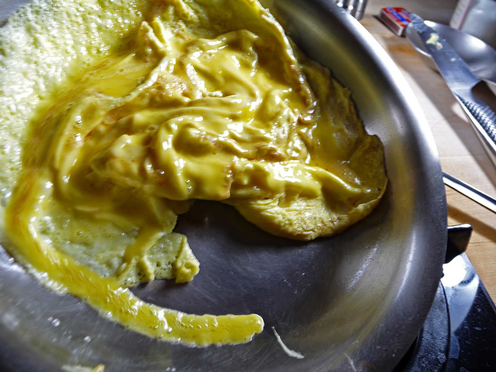 - Repeat all around the egg mass, fairly quickly, making sure you are creating a circular form of cooked egg, and letting the uncooked egg run UNDER and AROUND the cooked part, so that it gets cooked in turn.