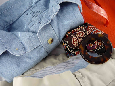 I'm envisioning you in your chambray and khaki and you look perfect! The orange Havianas are inspired (I'm wearing silver Reefs right now – they do go with everything). The diamond studs are enough, certainly, and indicate that you could dress up and up and up, if the occasion was right.