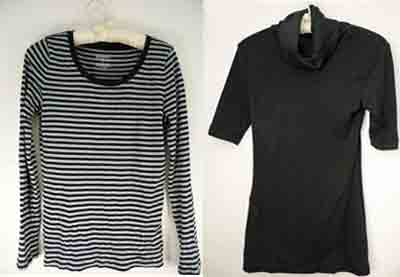 Merona gray and black striped Ultimate Tee, $13. Cowl-neck Mossimo Drapey tee, $10 (this exact version not online).