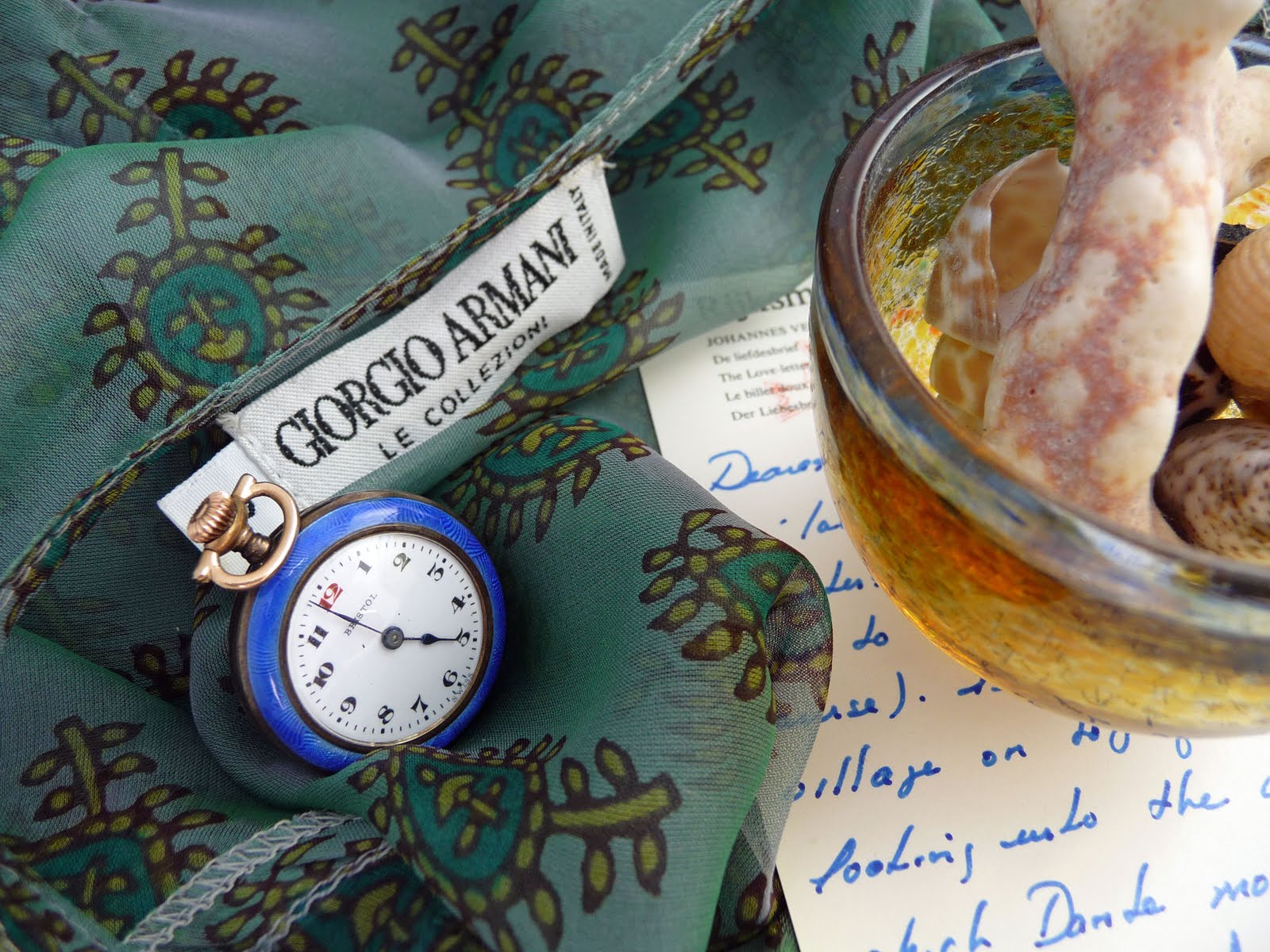 I have more. In the photo above you see a family enamel pocket watch I never carry, an inappropriate Armani tunic I bought in times of distress to wear to my son’s 8th grade graduation, and a postcard from my mother. With her inimitable boarding school handwriting. Oh, and random shells in a random glass piece from beaches somewhere.