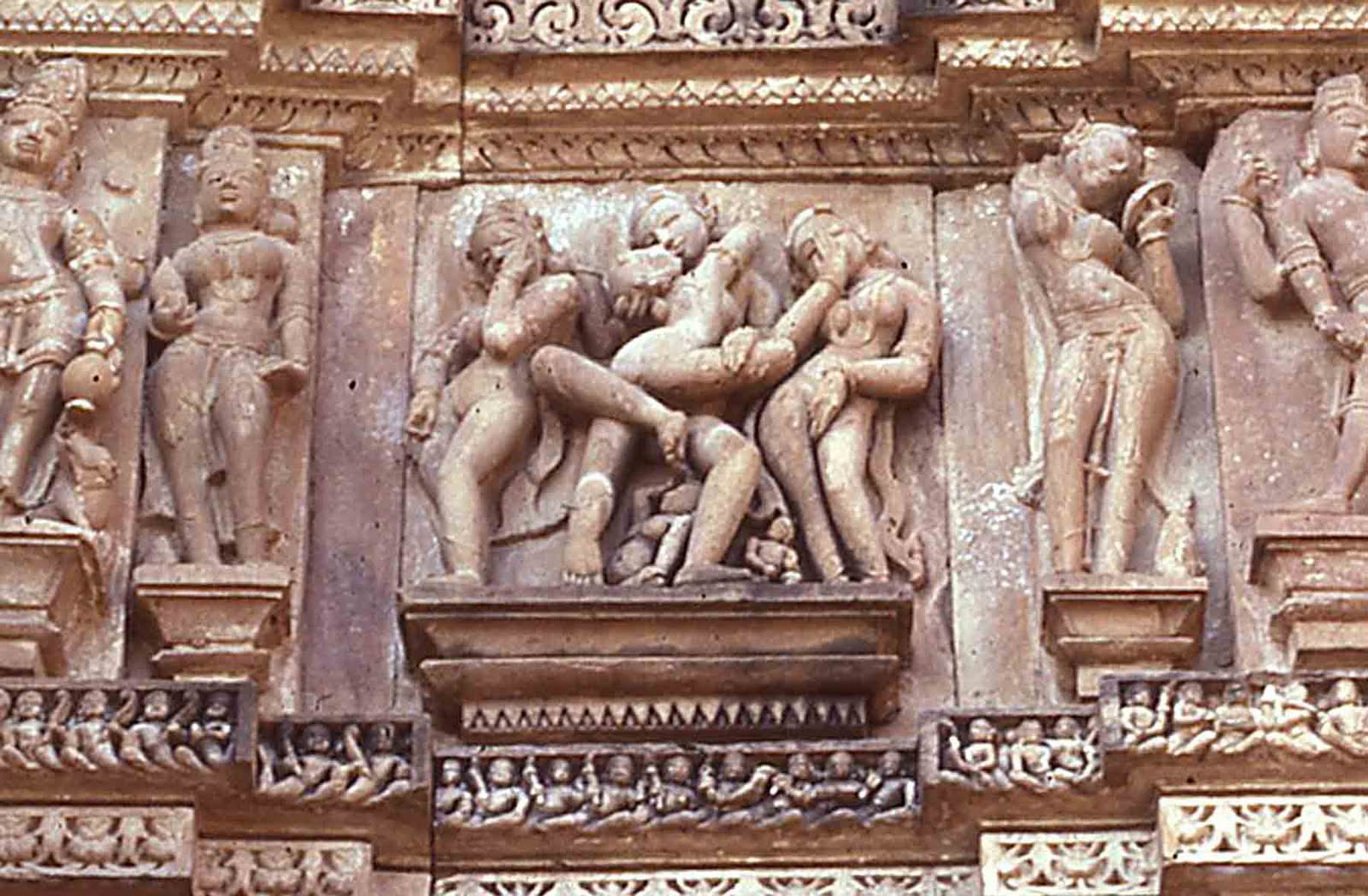 But, for the most part, and to their great and enduring fame, the temples at Khajuraho are carved with people making love. Imaginatively and with a keen sense of community. Look at her beautiful foot.